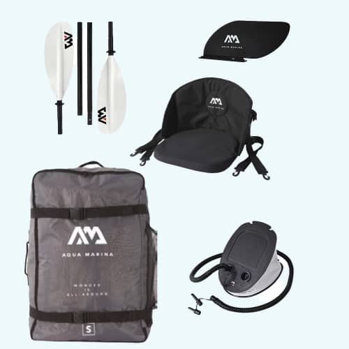 Zip Backpack (väska), 11″ Fotpump, 3st Kayak Säte, 2st Kajakpaddel, 2st Kajakfena